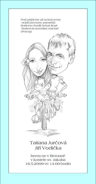 Kreslíme karikatury budoucích novomanželů na svatební oznámení. Na svatební veselici kreslíme karikatury hostů, portréty novomanželů. Vaši svatbu také profesionálně vyfotografujeme - dostanete fotografie i kresby - fotograf i karikaturista v jedné osobě!! Zvěčněte svoji svatbu milým a veselým způsobem, na který se opravdu nezapomíná.